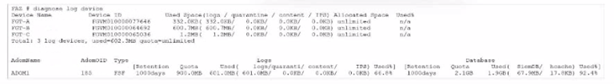 Look closely at the columns—especially around "quarantine / content / IPS". We see values like 0.00GB / 0.00GB (0.00%) or very small numbers. But zero used space doesn't automatically mean zero allocated quota. The output might show a quota limit if one were set (or "unlimited" explicitly). Here it appears more like the quota exists but hasn't been consumed yet. A common misconception is assuming "nothing used = nothing allowed"—but FortiAnalyzer can have quotas defined without immediate usage.