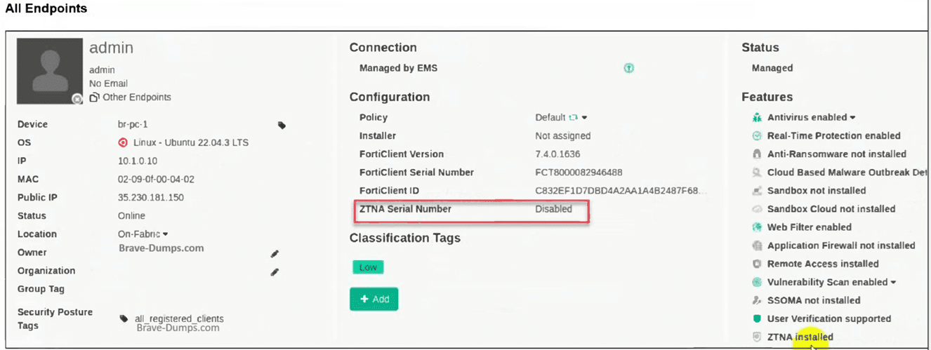The zero trust network access (ZTNA) serial number on endpoint br-pc-1 is in a disabled