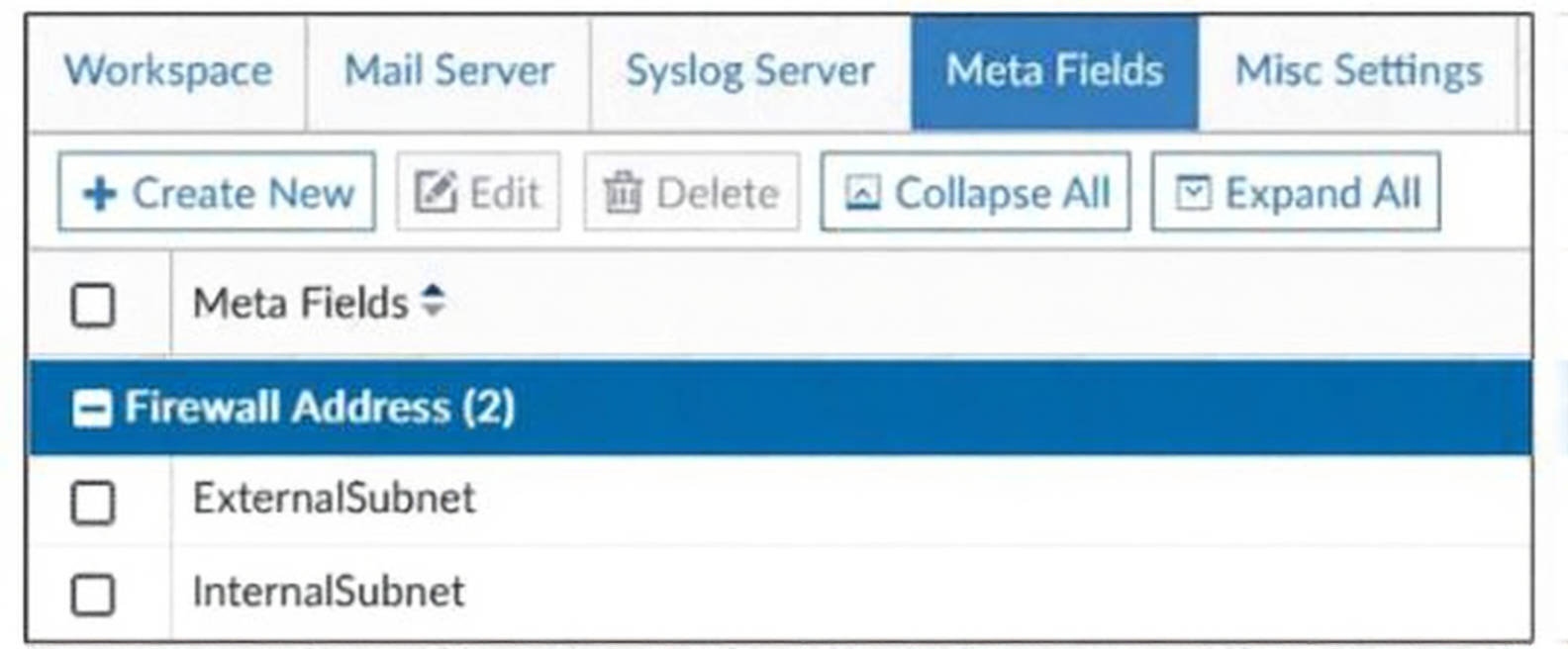 The exhibit clearly shows two meta fields—ExternalSubnet and InternalSubnet—created under the “Firewall Address” category in an ADOM’s Meta Fields configuration. Meta fields are custom tags or attributes that administrators can define and then assign to specific objects or policies to enhance organization, filtering, and reporting. In this case, these fields can be attached to address objects (like IPv4 addresses, ranges, or subnets) to classify them by their network role, making policy management more intuitive and searchable.