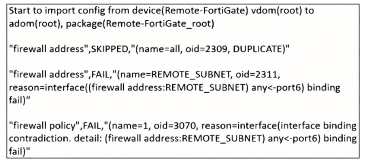 as the REMOTE_SUBNET object import FAILED; FortiManager does not force a change when interface mapping fails. The conflict must be resolved manually.