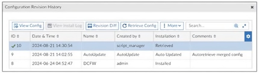 Refer to the exhibit, which shows a revision history window in the FortiManager device