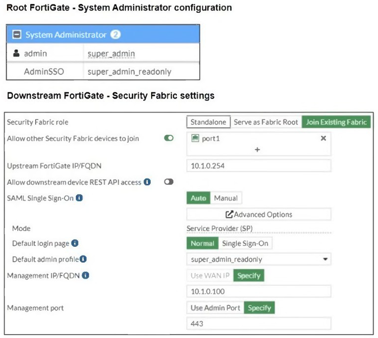 In this scenario, the downstream FortiGate is configured to use SAML Single Sign-On (SSO) via the Security Fabric. The user attempts to authenticate using the AdminSSO account, which is defined on the root FortiGate with the role super_admin_readonly.
