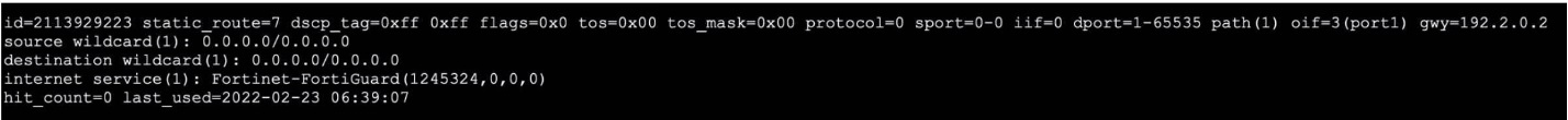 This explicitly shows that the policy route is matching traffic based on an Internet Service Database (ISDB) entry. The ISDB contains predefined services with their associated IP addresses and ports. In this case, it's matching traffic destined for the FortiGuard service.