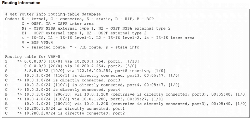 The entry for the BGP route to 10.0.4.0/24 is: B * > 10.0.4.0/24 [200/10] via 10.0.1.200, port3 (recursive is directly connected, port3), 00:05:40, [1/0]