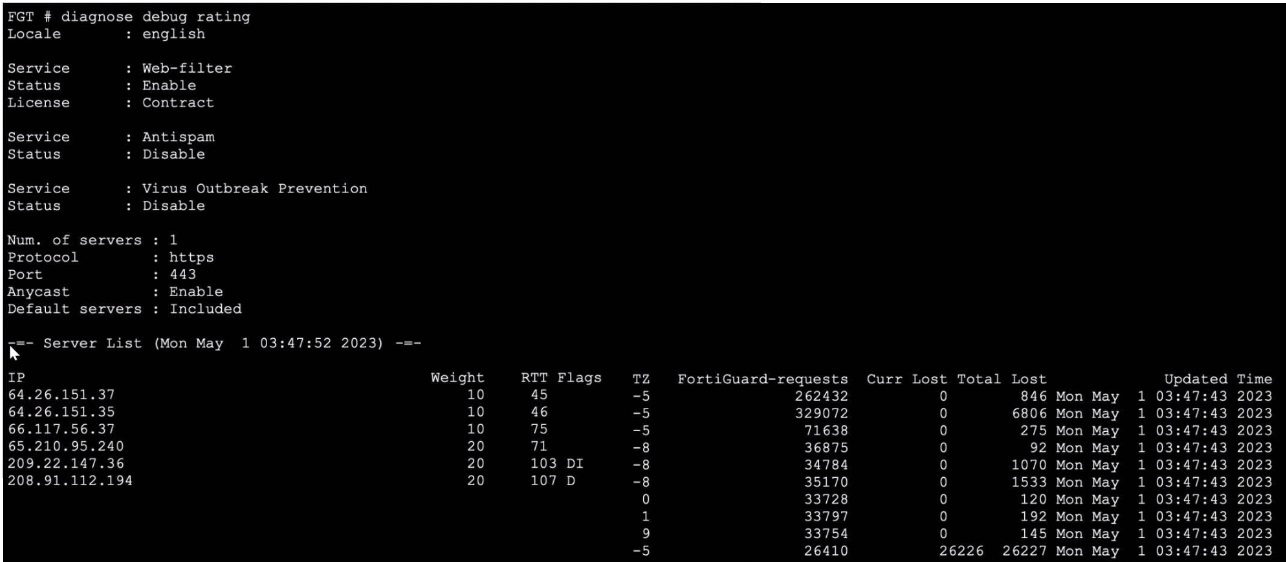 FortiOS uses FortiGuard servers for real-time security services. The command diagnose debug rating shows server selection metrics. The initial contract validation occurs with the first responsive server, often the one with the lowest RTT and highest weight.