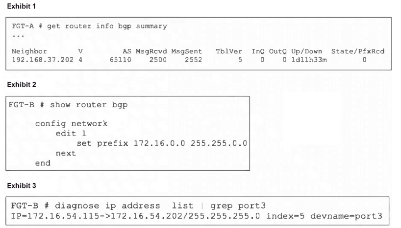The issue is that FortiGate B (FGT-B) has an interface port3 with IP 172.16.54.115/24, but its BGP configuration is advertising 172.16.0.0/16. By default, FortiOS has network-import-check enabled, which requires that a route must exist in the device's routing table (RIB) with an exact prefix length match before BGP will advertise it.