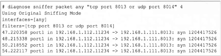 Security Fabric uses TCP 8013 for FortiTelemetry/control. The sniffer shows repeated SYNs to 8013 with no SYN-ACK, indicating the path or the upstream device is not accepting or the port is filtered. Unblock/allow 8013 end-to-end.