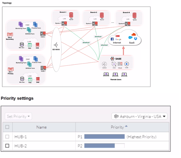 The exhibit shows the SD-WAN "Set Priority" table for the Ashburn location. HUB-1 is configured as the highest priority (P1) path. FortiSASE uses SD-WAN rules and performance metrics to make routing decisions. For traffic destined for internal resources, it will select the highest-priority available path to enter the corporate network, which in this case is via HUB-1. Once inside the corporate network, internal routing will direct the traffic to Branch-2.