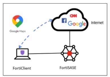To inspect all endpoint traffic while excluding specific applications (such as Google Maps), FortiSASE supports split tunneling. Split tunneling allows administrators to specify destinations that should bypass the FortiSASE VPN tunnel and instead use the local physical interface. By configuring Google Maps as a split-tunnel destination in the endpoint profile, FortiSASE inspects all other traffic while allowing Google Maps to exit locally.