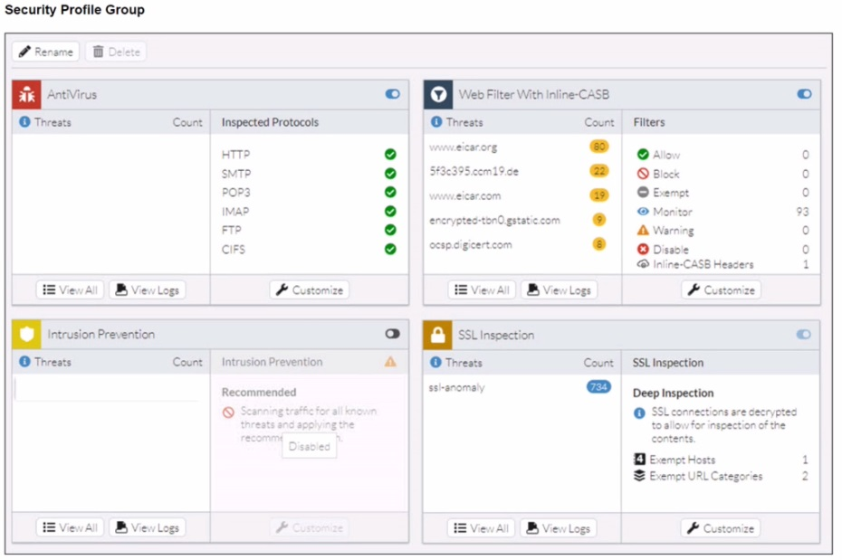 The EICAR test file is a known threat that should be blocked by the Antivirus profile. However, the logs show the download from www.eicar.org was allowed. The key detail is that the traffic is HTTPS. For Antivirus to scan the content of an encrypted HTTPS connection, it must first be decrypted. The configuration preventing this is found in the "Secure Internet Access policy" exhibit.