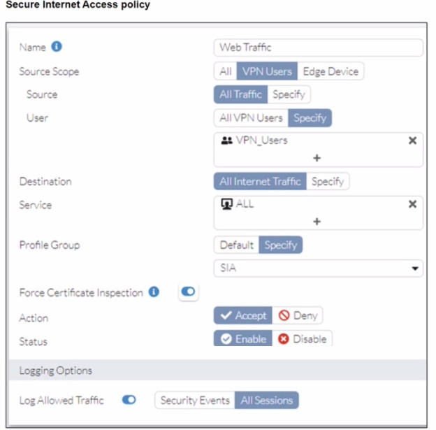 Traffic from a FortiClient endpoint to FortiSASE for Secure Internet Access (SIA) is transported over a ZTNA-based or SSL-based VPN tunnel. Before FortiSASE can apply SWG or other security policies, the client-to-cloud tunnel must first be established. This connection is governed by a VPN policy, which controls and secures the initial traffic flow from the endpoint into the SASE fabric.