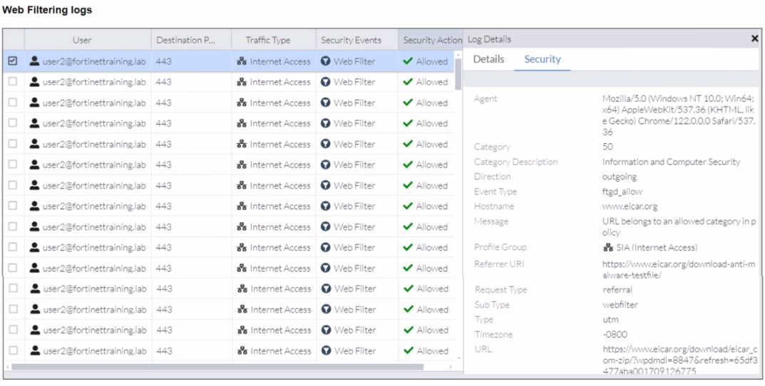 The Web Filter did allow the traffic, but this is a symptom, not the root cause. The Web Filter correctly allowed the "Information and Computer Security" category. The failure lies with the Antivirus profile, which is responsible for detecting and blocking the malicious file inside the allowed web traffic.