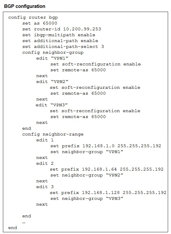 The exhibit shows the BGP configuration on the hub in a hub-and-spoke topology. The