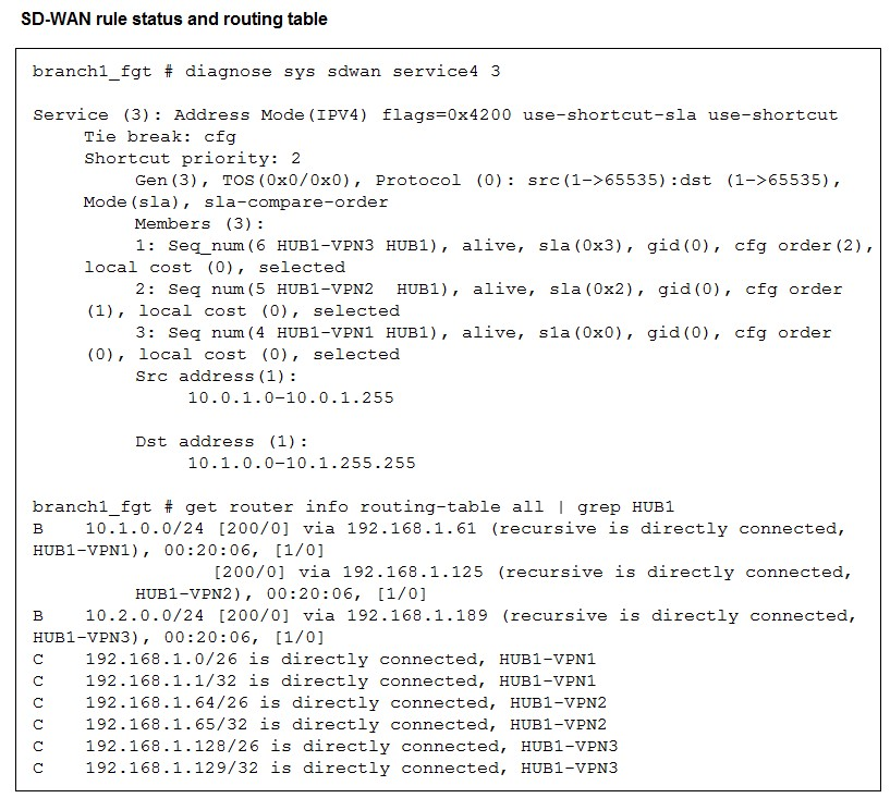The SD-WAN configuration is using SLA + explicit priority members, not a round-robin or per-packet load-balancing policy. The diagnostics show a single selected shortcut member (the second priority). Therefore traffic is routed to the chosen overlay (HUB1-VPN2), not equally across all three overlays.