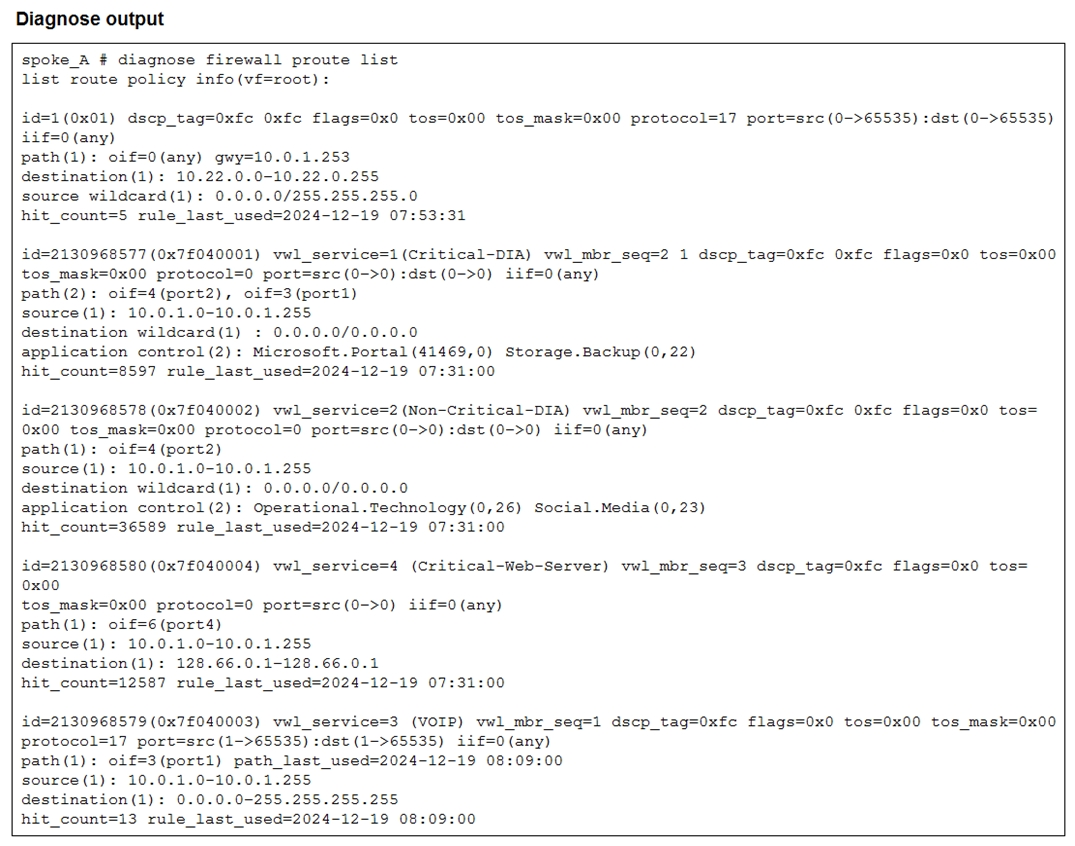 The exhibit shows the output of the FortiGate command diagnose firewall proute list, which lists both traditional Policy Routes (PBR) and SD-WAN Rules (which are implemented as policy routes with special internal identifiers). The output reveals an entry that is clearly an SD-WAN rule because it has the destination internet-service-app-ctrl and a very large, non-sequential id value. The second entry shows a standard, low-numbered id that matches a specific destination subnet, which is characteristic of a Policy Route.