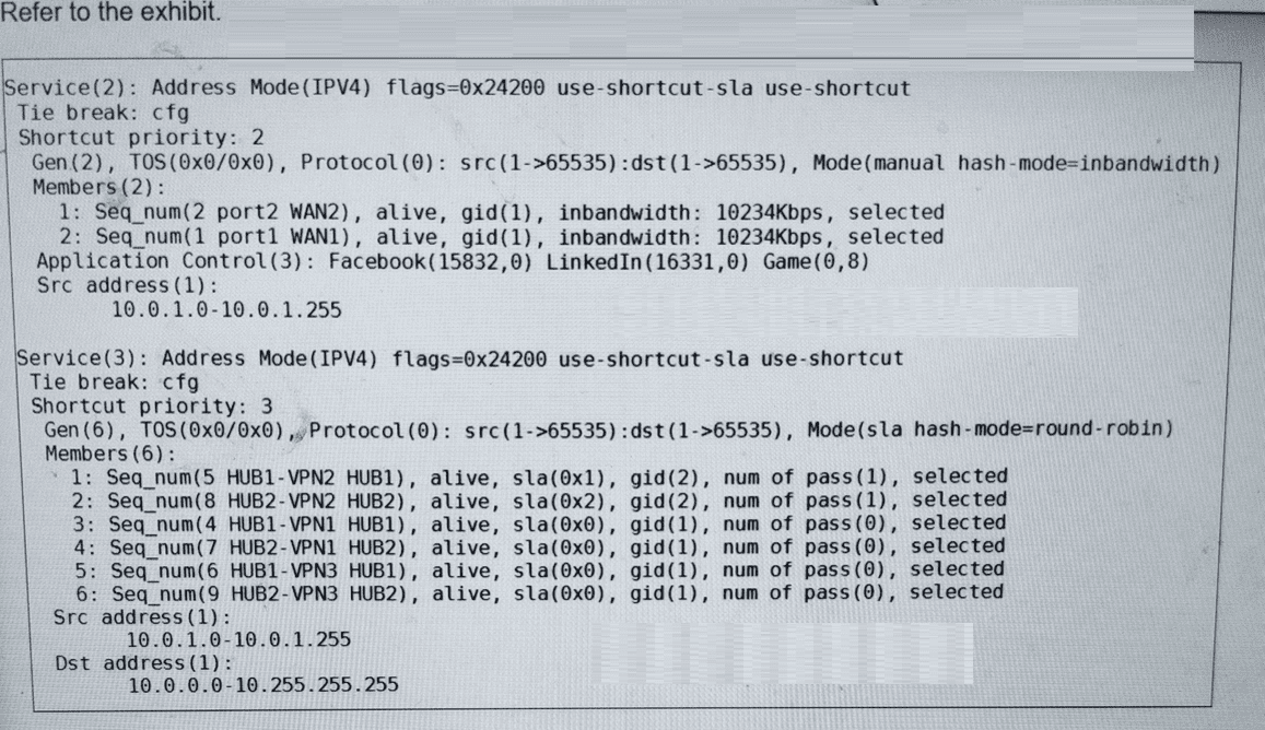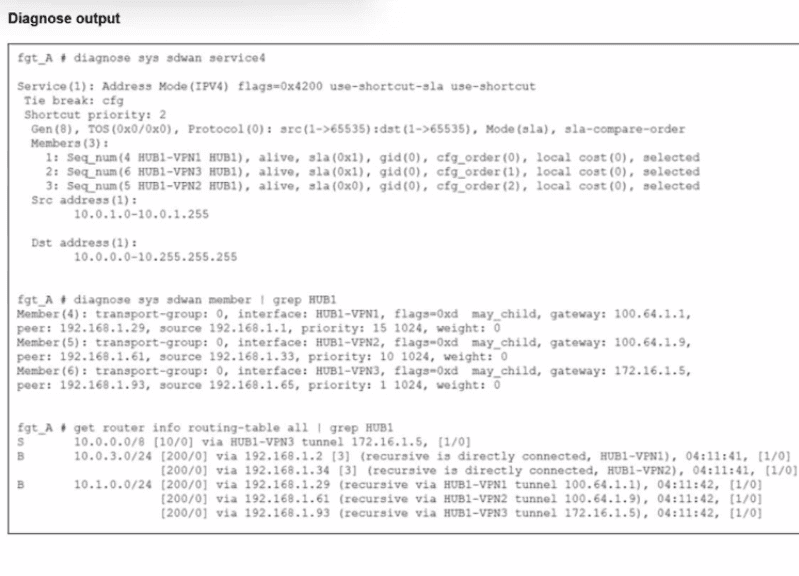 Option A (HUB1-VPN3 has a higher member configuration priority): The diagnose sys sdwan service output shows that for Service ID 4, the cfg_order for HUB1-VPN1 is 0 (which is the highest priority in config order), while HUB1-VPN3 is 1. If the SD-WAN rule was being followed correctly, it would prefer VPN1. Therefore, configuration priority isn't the reason for the failure; it's the reason why the behavior is unexpected.