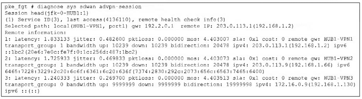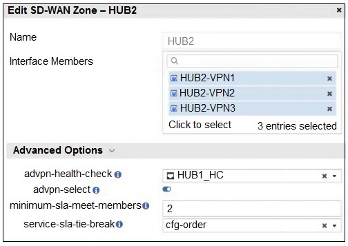 ❌ A. The configuration instructs FortiGate to choose an ADVPN shortcut based on SD-WAN information. While ADVPN 2.0 does use SD-WAN telemetry to choose paths, this is a general description of the ADVPN/SD-WAN integration. It does not specifically address the logic of the minimum-sla-meet-members setting shown in the exhibit.