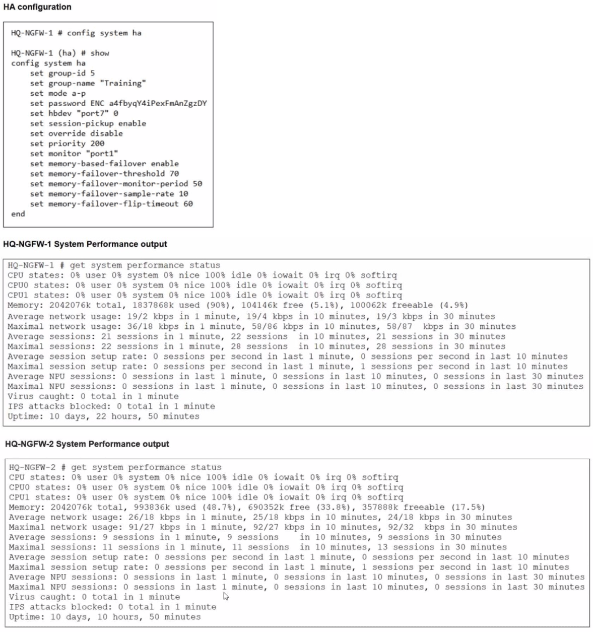 C: Even though HQ-NGFW-1 has a higher priority (200) and override might be disabled, the specific memory-failover trigger has already transitioned the role to HQ-NGFW-2.