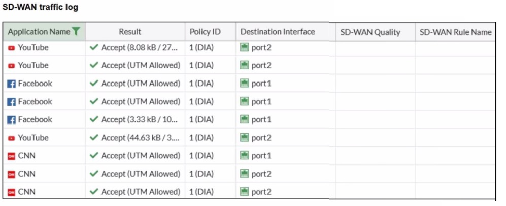 ✔️ Analyzing the Logs: Your logs show "YouTube" traffic consistently going to port2 and "Facebook" to port1. While this looks like steering, without a specific rule name, it is the result of the implicit rule's load-balancing decision. The traffic for "CNN" is split between port1 and port2, which is classic behavior of a load-balancing rule, not a specific performance rule tied to a named application.