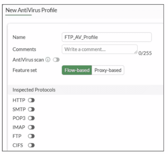 The Antivirus scan switch is grayed out because no inspected protocols are selected in the FTP Antivirus profile. In FortiGate, the Antivirus scan option becomes available only after enabling at least one protocol (such as FTP) under Inspected Protocols, as antivirus scanning requires a protocol context to operate.