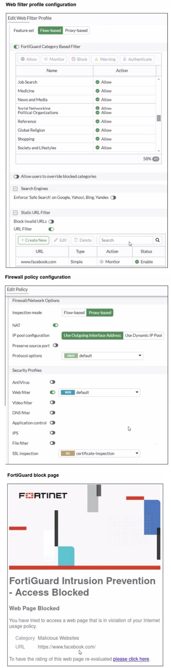A web filter profile configuration and firewall policy configuration are shown.