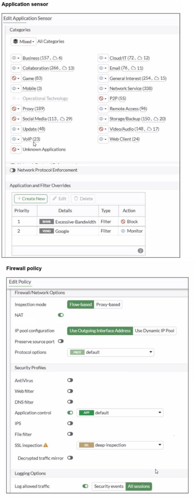 The question tests understanding of Application Control processing order in FortiOS 7.6, including category actions versus priority-based Application and Filter Overrides. The sensor shows category-level blocks (e.g., Social Media) and two overrides evaluated top-down. The firewall policy applies the sensor (APP default) with deep SSL inspection.
