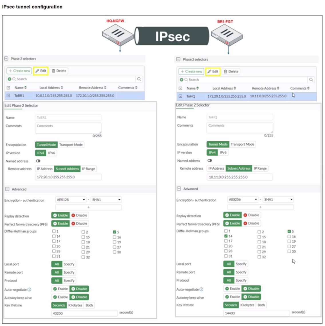 ❌ C. Changing the key lifetime on BR1-FGT does not resolve the mismatch in subnets or encryption.