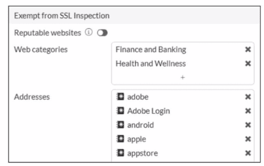 ⇒ https://docs.fortinet.com/document/fortigate/7.6.6/administration-guide/709167/configuring-an-ssl-ssh-inspection-profile — Confirms Finance and Banking, Health and Wellness (and Personal Privacy) are added by default to exemptions in full SSL inspection; mentions reputable websites option separately.