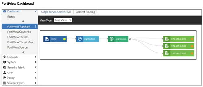 The FortiView topology shows the ingress service and backend nodes, but traffic health indicators suggest communication failure. This typically happens when the FortiWeb VM cannot reach Kubernetes worker nodes. If the FortiWeb VM lacks a route to the node subnet, it cannot forward traffic to backend pods, causing the observed degraded or inactive status. Proper routing between the FortiWeb network and node subnet is mandatory for ingress traffic flow.