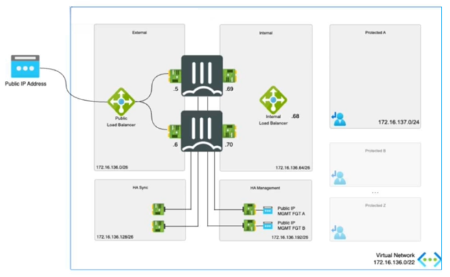 The exhibit shows an active-passive high availability FortiGate pair with external and internal Azure load
