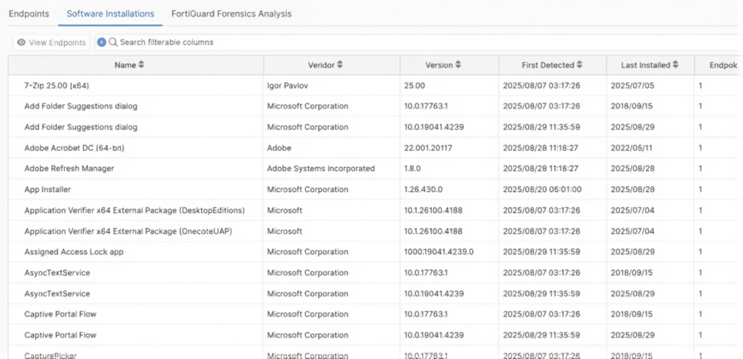 Option B: Although the output correctly displays the "First Detected" date for applications, FortiSASE does not directly handle the automatic patching of third-party software from this specific dashboard view. Patch management is typically a function of a dedicated UEM or the FortiClient EMS Vulnerability Scan module. This view is primarily for visibility and inventory purposes rather than active remediation or patching orchestration.