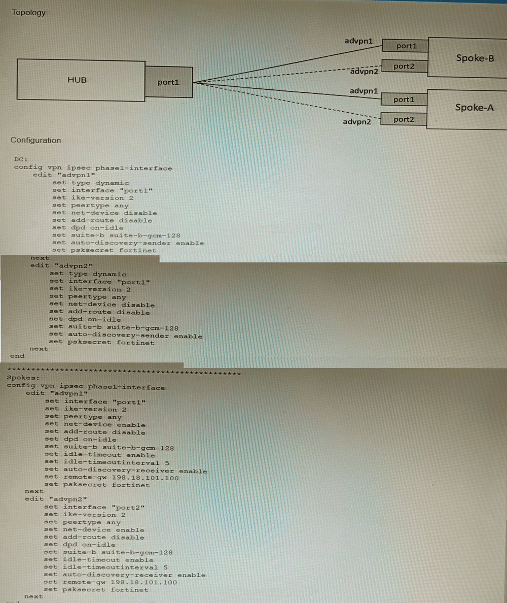 Using network-overlay id is the specific FortiOS feature designed for this exact scenario. This feature allows multiple ADVPN tunnels (Phase 1 interfaces) to share the same physical interface and IP address by assigning a unique Overlay ID to each tunnel. The Hub can then correctly identify and separate the IKE sessions for advpn1 and advpn2 even though they arrive on the same interface/IP.